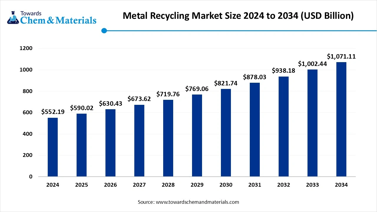 Ottawa, Oct. 07, 2025 (GLOBE NEWSWIRE) -- The global metal recycling market size was valued at USD 552.19 billion in 2024 and is anticipated to reach around USD 1,071.11 billion by 2034, growing at a compound annual growth rate (CAGR) of 6.85% over the forecast period from 2025 to 2034. A study published by Towards Chemical and Materials a sister firm of Precedence Research.