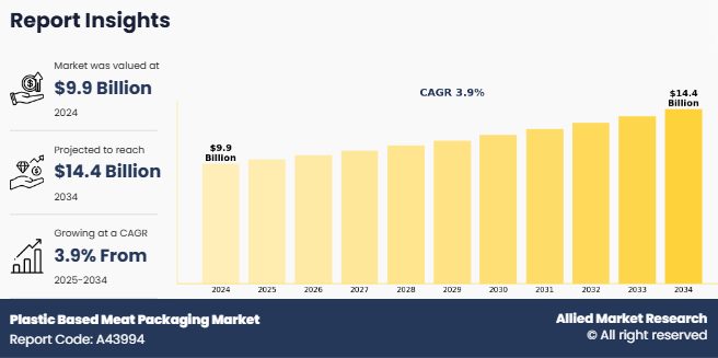 WILMINGTON, DE, UNITED STATES, October 23, 2025 /EINPresswire.com/ -- Allied Market Research published a report, titled, "Plastic Based Meat Packaging Market by Product Type (Trays, Clamshells, Bags & Pouches, and Others), Material Type (Polyethylene (PE), PET, Recycled PET (rPET), Polypropylene (PP), and Others), and Meat Type (Chicken, Beef, Pork, and Others): Global Opportunity Analysis and Industry Forecast, 2025-2034". According to the report, the "Plastic Based Meat Packaging Market" was valued at $9.9 billion in 2024, and is estimated to reach $14.4 billion by 2034, growing at a CAGR of 3.9% from 2025 to 2034.Rising Global Demand for Meat Products